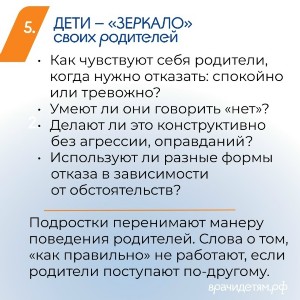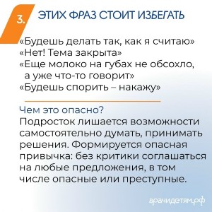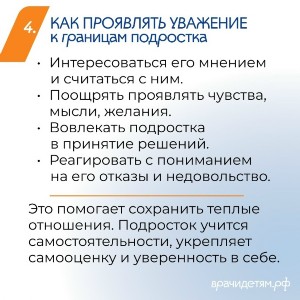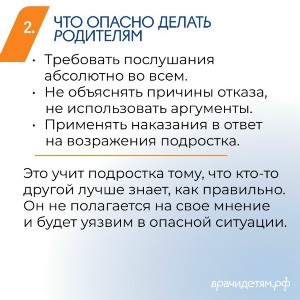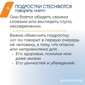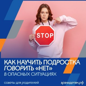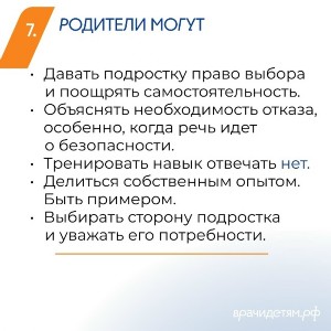 Психологи Врачи детям и кризисной службы для подростков ПомощьРядом.рф рассказывают в карточках, что могут сделать родители, чтобы научить подростка отвечать «нет» в опасных ситуациях.