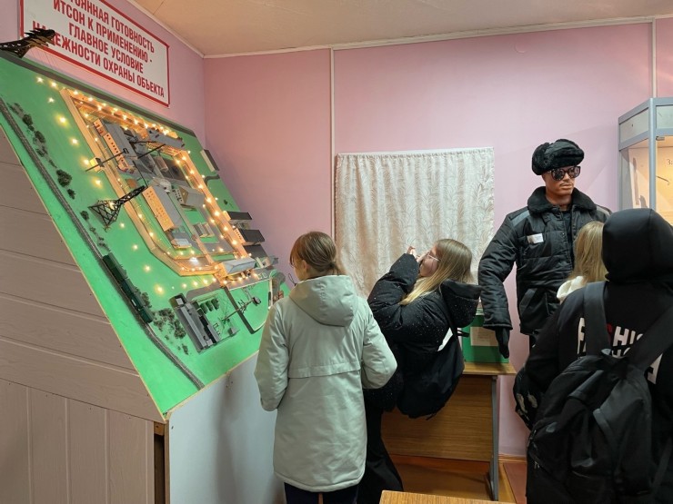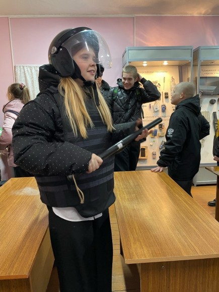 Вторая часть экскурсии была не менее интересной. Ребят провели по посту охраны, где они смогли познакомиться с буднями сотрудников ФСИН. Экипировка стража порядка: ребятам подробно показали амуницию сотрудника: бронежилет, каску, разгрузочный жилет и многое другое. Ребята даже примерили некоторые элементы и почувствовали, какая это ответственность — носить такую форму.
