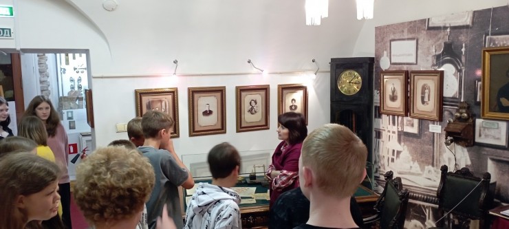 Путешествуя по дому и детально изучая экспонаты, ребятам предстояло раскрыть преступление и выяснить, кто из десяти подозреваемых на самом деле виновен. Разбившись на группы, семиклассники обошли в поисках подсказок весь дом и вычислили виновника пропажи. Получилось настоящее детективное расследование с подозреваемыми, уликами и алиби!