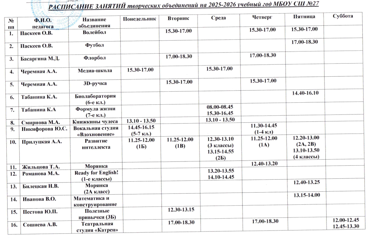 Расписание занятий на 2025-2026 уч.год
